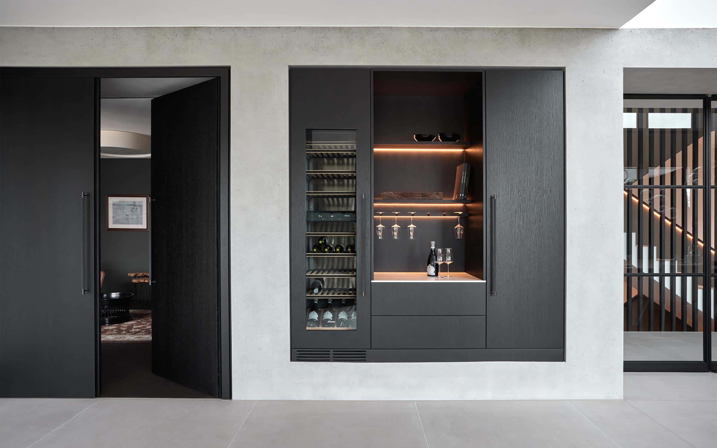 Planung und Realisierung der Inneneinrichtung eines Wohnhauses mit den Bereichen Garderobe, Küche, Wohnzimmer, Hauswirtschaftsraum, Büro, Ankleide, Schlafzimmer und Bäder.